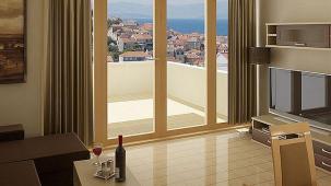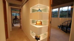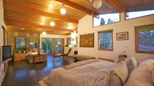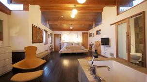 This apartment with nice shades of blue and a beautiful bathroom will help you to relax after work.